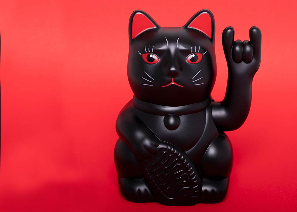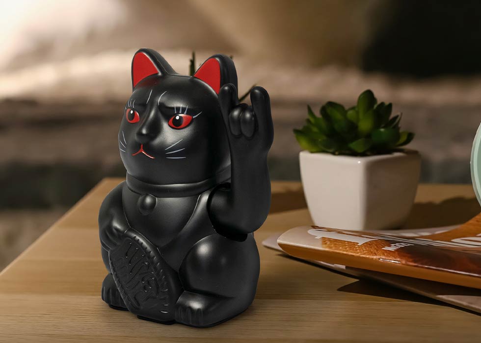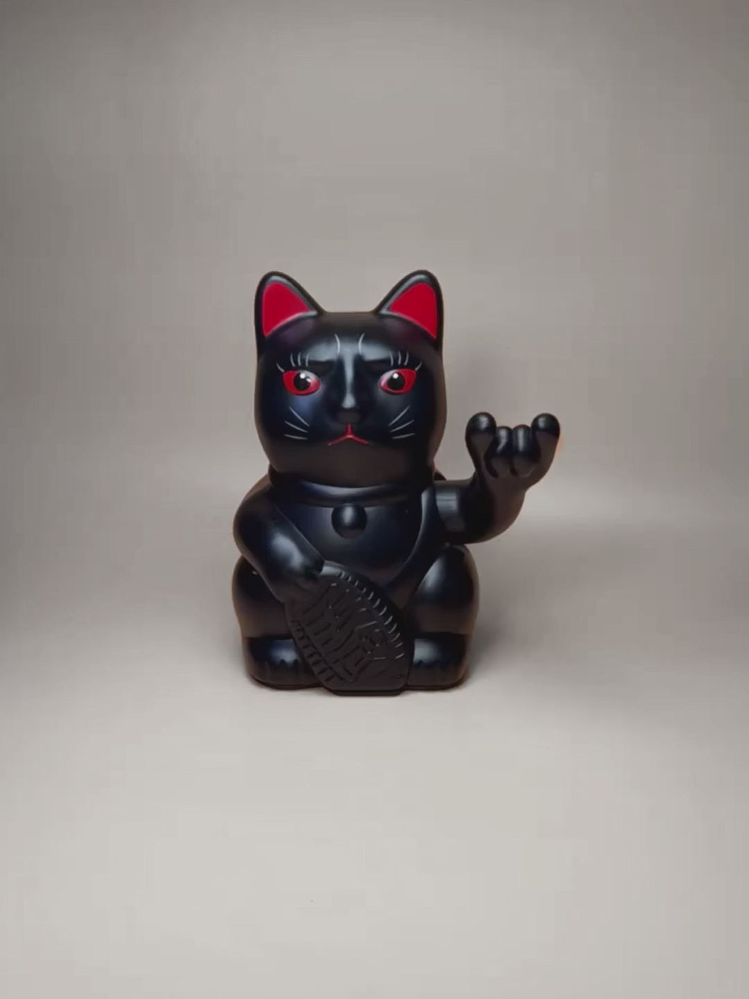 Il popolare gatto ammiccante e fortunato dell'Asia con una differenza - ora come ROCK CAT! Un gatto nero e arrabbiato, con un'aria da moccioso, occhi diabolici e una "forchetta per patatine fritte" che si muove a ritmo di rock. In un fantastico colore nero opaco e con mano "HEY HO" a batteria che si muove in avanti e indietro. Disegnato da Fluffy a Berlino.