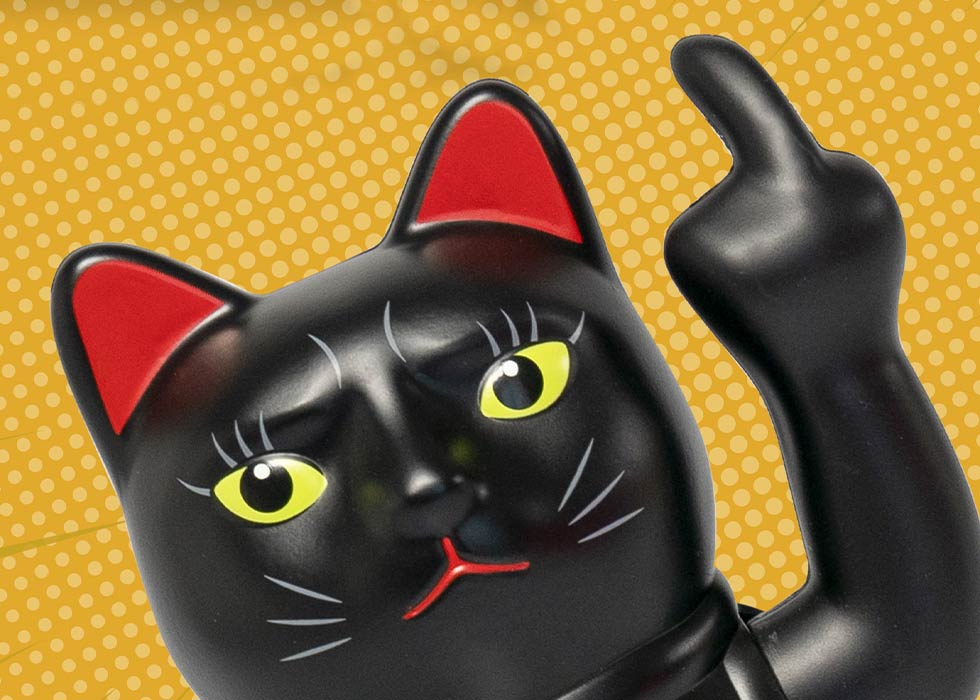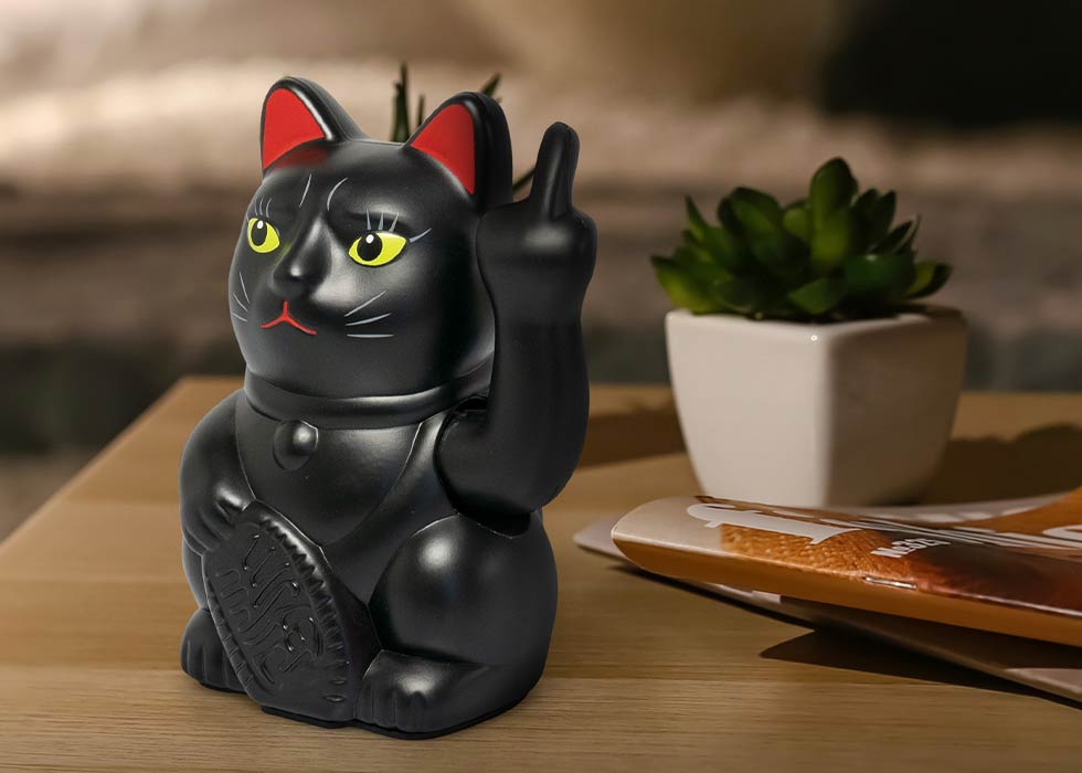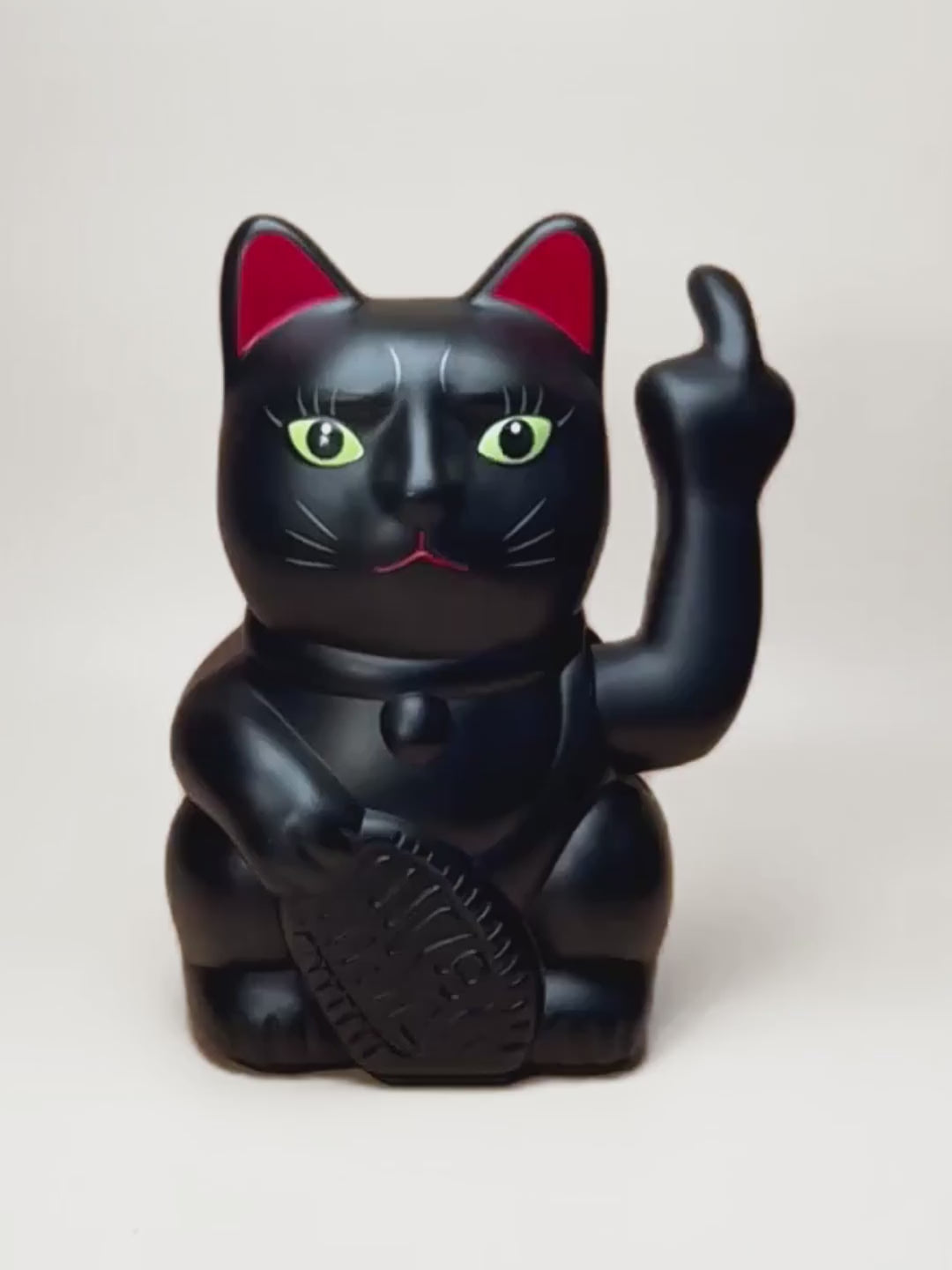 Jetzt winke ich! Die beliebte Winkekatze und Lucky Cat aus Asien mal anders - jetzt Angry! Aus Winkekatze wird Stinkekatze! Endlich mit fiesem Blick und bewegendem Stinkefinger als Statement. In toller matt-schwarzer Farbe und mit batteriebetriebenem Arm, der sich nach vorn und hinten bewegt. Designed by Fluffy in Berlin.
